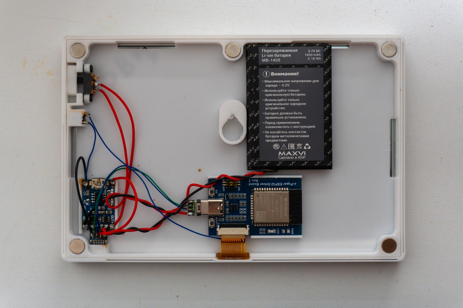 Li-ion battery 1 Maximum thickness 7.4 mm. Updating once an hour, a 1400 mAh (5.18 Wh) battery lasts for about a month of operation