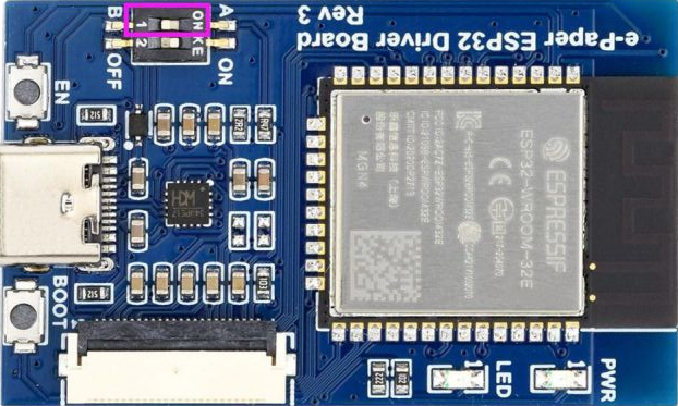 1. Set switch #2 on the ESP32 to the "ON" position. This switch controls the power to the UART module via USB. When the module is not in use, you can manually turn it off to save power (if switch 2 is in the "OFF" position, downloading the program is impossible).